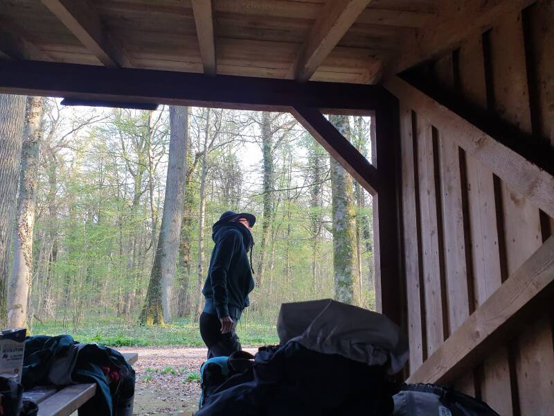 Wir wachen im Wald auf. Um viertel nach sieben in der Früh werden wir wach. Keinesfalls tagbereit, drehe ich mich nochmal um. Äußerst kemütelich eingekeilt unter Tisch oder Bank - so schläft sichs am besten.