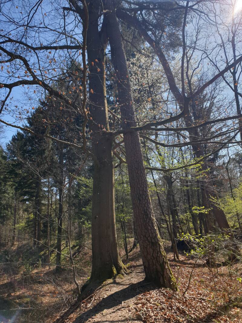 Da sind zwei Bäume - ich glaube, es sind eine Kiefer und eine Buche, aber Papa, korrigier mich gerne. Die stehen da, einfach so. Über unserem Weg - noch immer im Bienenwald - und halten sich aneinander fest. Sie wachsen miteinander. Stützen sich, obwohl sie doch so verschieden sind. :)