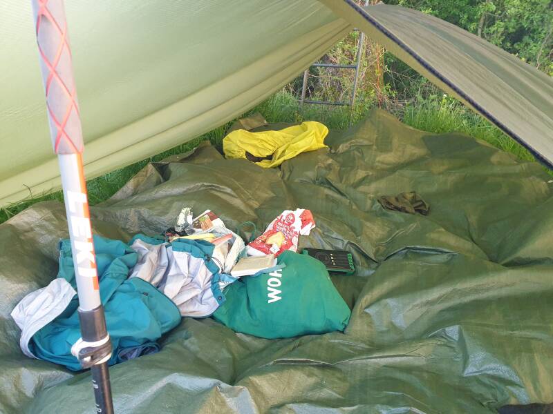 (Blieb er auch.) Dennoch erdachte ich mir bis kurz vorm Einschlafen schlagfertige Argumente aus, warum ich genau hier mein Tarp aufschlug. Sie endeten meist in: "Ich mache Biwaking. Ich konnte wirklich nicht mehr weiterlaufen."