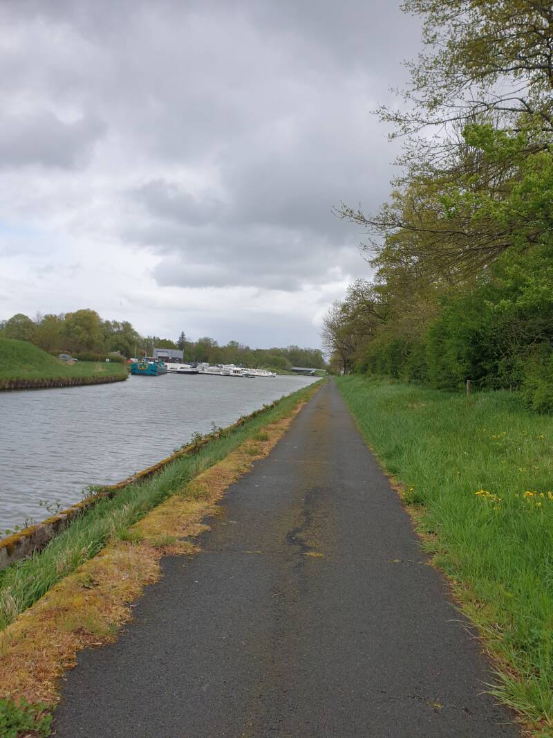 In den ersten wahrlichen Regentropfen des Tages, frühstücke ich mit Blick auf den Kanal der Madame von Rhein, die etwas weiter den Kanal der Sarre trifft. Es tröpfelt, aber was macht das schon, wenn man Brioche mit Schokocreme bei sich hat.