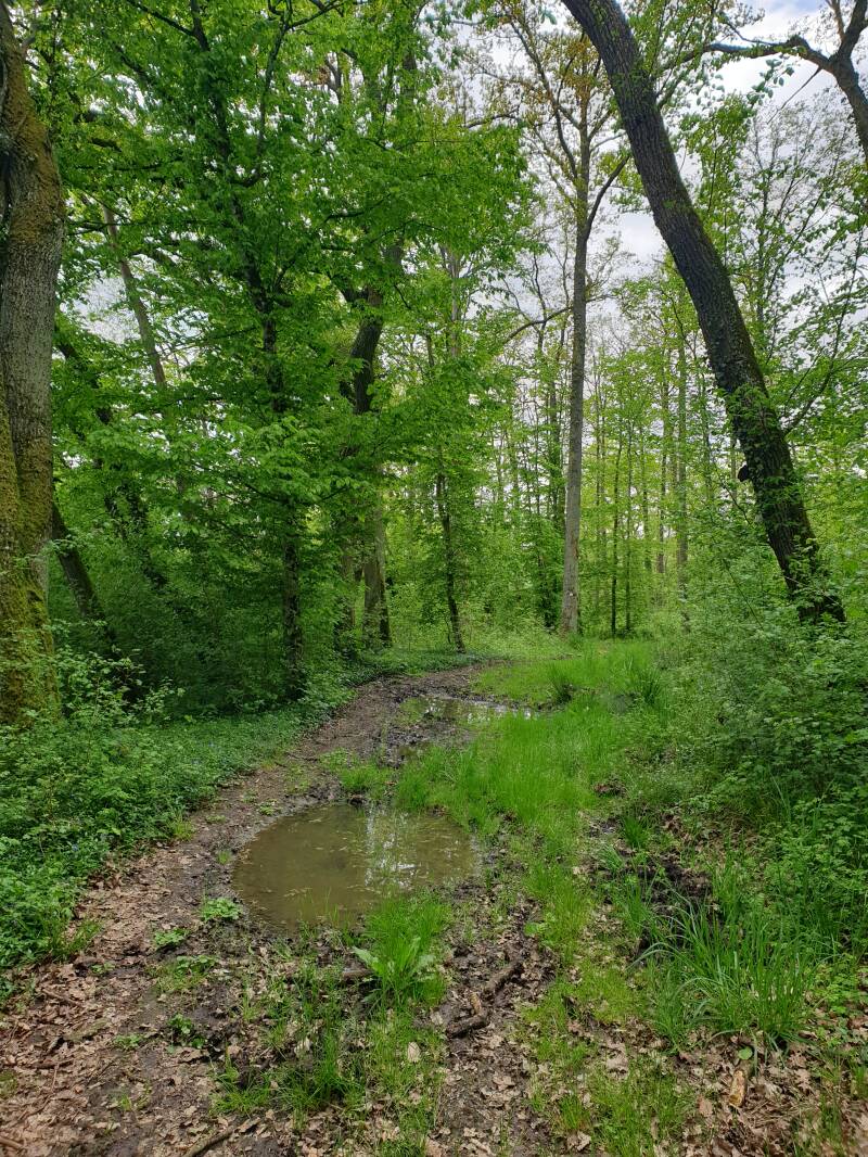 Da war dieser Weg, dem ich durch den Wald über viel aufgeweichten Boden folgte und ich badete ganz tief. Im einzigen Ort, in den ich lief an diesem Tag - Grémecey - fand ich einen Mann beim Rasenmähen. Gemeinsam gingen wir das Stück bis zu seinem Haus und dem Tipp der beiden nachgehend und etwas weiter fand ich dann eine Wiese. Wiesen sind hier überall; wohin das Auge blickt, nur vor allem stehen Schafe oder Kühe darauf.