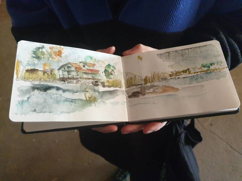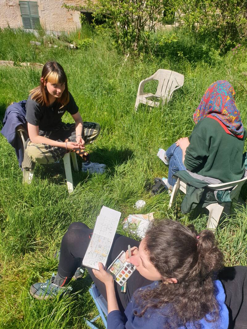 Die beiden Frauen, die auch wie wir gestern hier ankamen und wie ich auch zum ersten Mal ihre Füße auf diesen Grund setzen - Alma und Astra sind ihre Namen hoffe, glaube, denke ich mich zu erinnern - werden des Morgens von Lison interviewt. Ich nutze die Zeit zu schreiben. Haach, was ist das eine Freude, mit einem Laptop zu tippen. Das Schriftstellerequivalent zum Gaumenschmaus ist das. Die zwei Frauen malen mit Aquarell und Astra zeigt mir ihren Block, in dem sie Orte malt, an denen sie ist. Gerade auf dem Weg nach Draußen, in der Scheune bleiben wir stehen. Das ist wie ein Türrahmengespräch; nur die Welt ist unser Ramen, unser Raum.