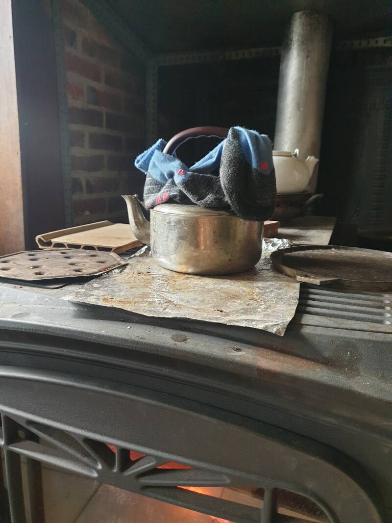 Sie macht mir die Tür auf und sagt, na klar kann ich bei ihr aufs Klo gehen. Es ist richtig warm bei ihr. Wie Zuhause. Im Winter oder späten Frühling. Wenn es manchmal noch etwas kalt ist am Morgen. Bei ihr brennt Feuer im Ofen und nachdem ich dann bei ihr bleibe, legt sie noch zwei Scheite nach. Meine Schuhe stellt sie unter den Ofen - dass sie gut trocken sind morgen. Und die Socken, da siehst du ja selbst, wo sie trocknen. :p