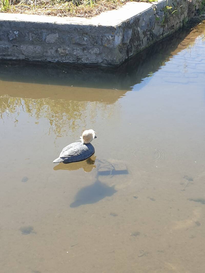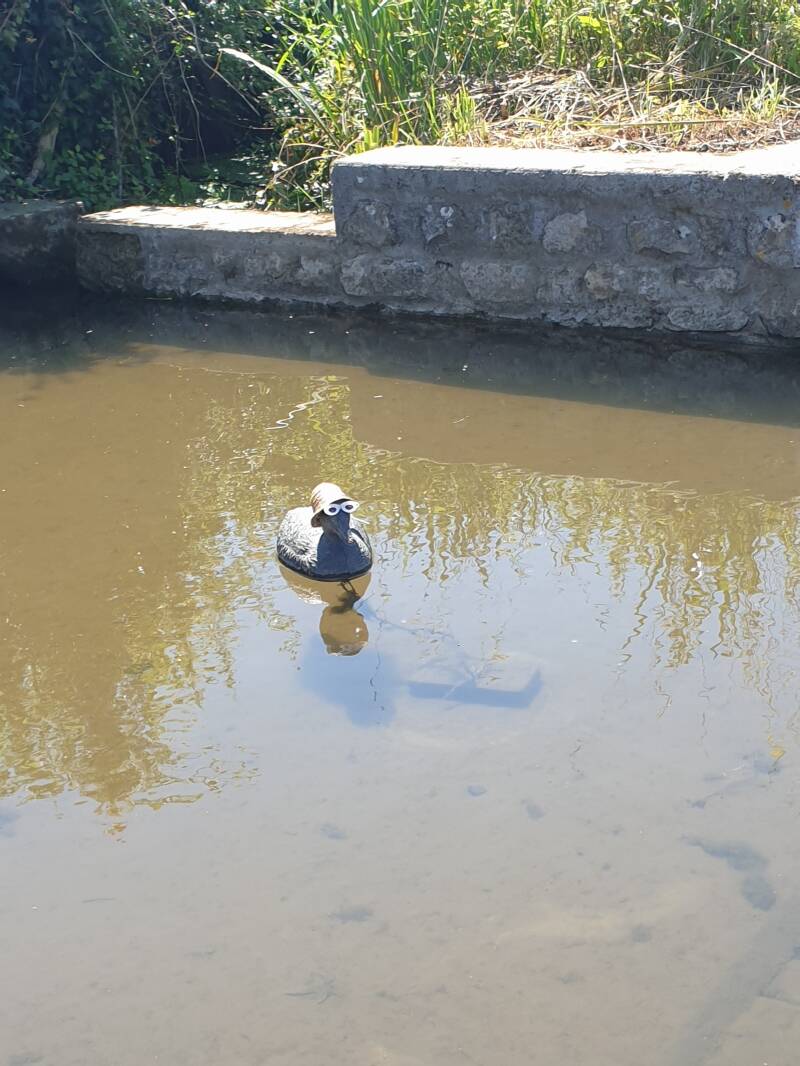 Da war eine Ente voll Anmut ...an einem Stein festgebunden - ihr minni Sombrero schützt sie vor Sonnenbrand - die in einem kleinen Tümpel dahin dümpelte.