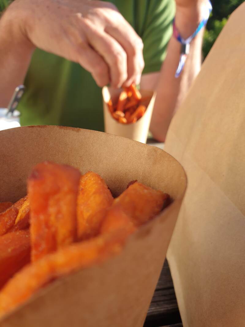 ßehr köstlich gespeist haben wir des Abends, von einem Essensvan bekocht auf dem Campingplatz in Carentan-les-Marais; von Süßkartoffeln, über Curryreis zu Fritiertem mit Fritiertem.