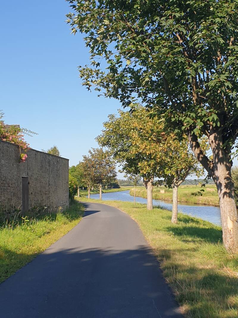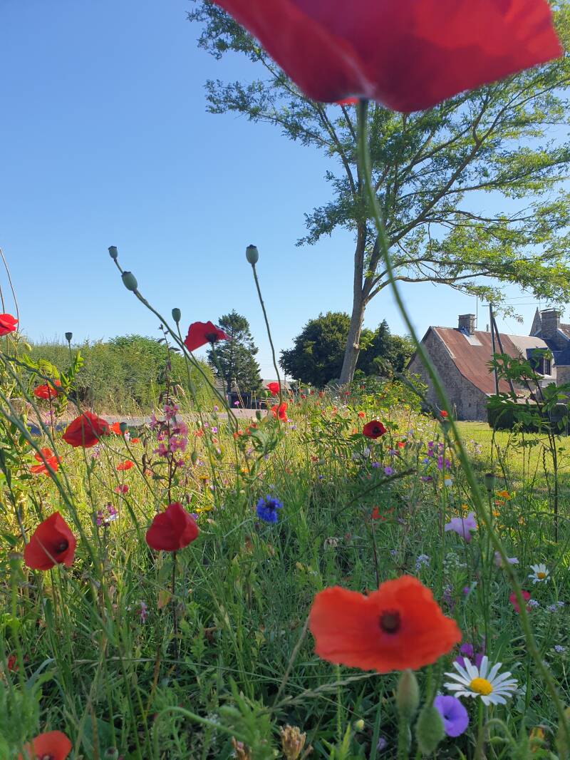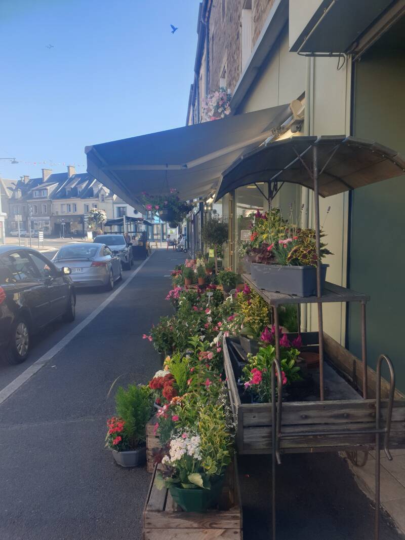 In Richtung La Haye de Puits. Irgendwie. Erst mit Kompass, dann mit Karte. Südwestlich muss ich. Und wenn ich heute dort noch ankomm', find ich vielleicht Schuhe. Meine - die, die mich bis hier hin trugen, wollen nicht mehr weit. Drei Schuhgeschäfte. Vielleicht find ich ja tatsächlich was. Es ist Samstag, also heute oder nie :p. - Das im Baumarkt allerdings nicht. Trotz gutem Denken von Magali - die Frau mit dem rot dezentierten Schmuck. Die mir neben meiner aufgefüllten Wasserflasche auch ein Glas Erdbeer-Zitronenwasser zum Trinken gab, während hinter uns ihr Mann mit Bagger, Mauer und Busch kämpfte.
