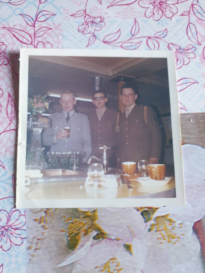 Im August 1964 bei einem Manöver verbrachte er (Jean) einen Monat mit einem deutschen Soldaten in le valdahon, département de doubs, den er sehr zu mögen lernte. Er weiß weder seinen Namen mehr und dieses Foto hier und die Erinnerungen der gemeinsamen Zeit sind alles, was bleibt. Er würde gerne wissen, ob er noch lebt, dieser nette Herr, der sie allzu oft abends auf ein Bier einludt; weil die Deutschen, die waren deutlich besser ausgestattet als wir. Und auch: seine Uniform. Schau mal, wie er aussah. Ganz ordentlich.