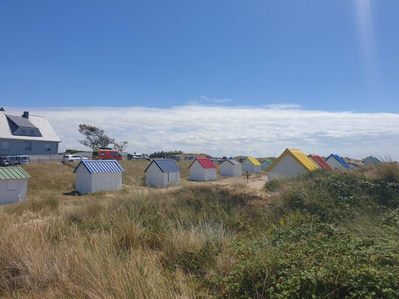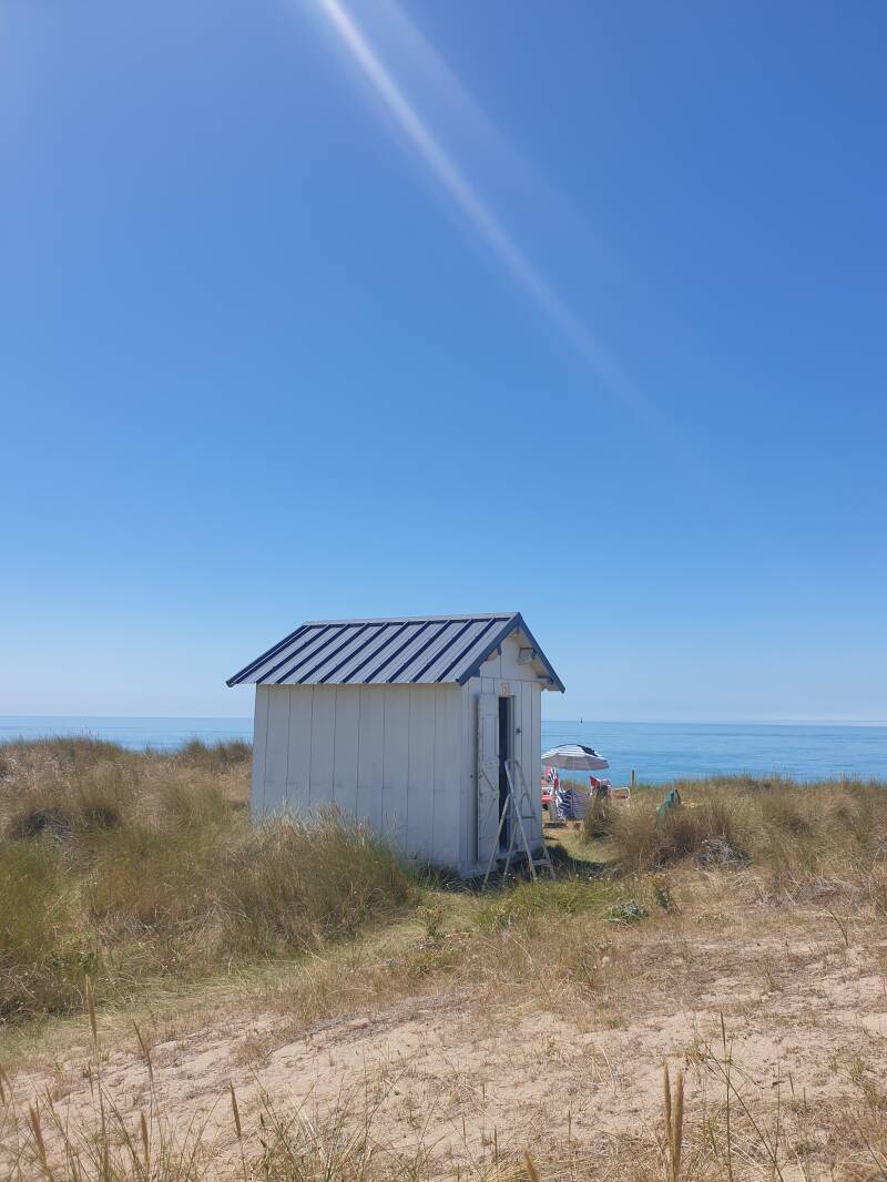 Hier, das sind die Cabines vom Strand bei Gouville-sur-Mer. Bei zweien, die im Sonnenschirmschatten vor ihrem Hüttchen saßen, durfte ich sogar einmal hineinlunsen. Er erzählt mir, dass sie vor ein paar Monaten das Innere mit Holz verkleidet haben und so riecht es auch. Ganz vertraut und so tief geht dieser Duft. Sogar ein kleines Kabuff zum Schlafen haben sie oben eingebaut und eine Herdplatte zum Kochen. Erstaunlicherweise ist es auch ohne Dämmung kühl im Inneren.