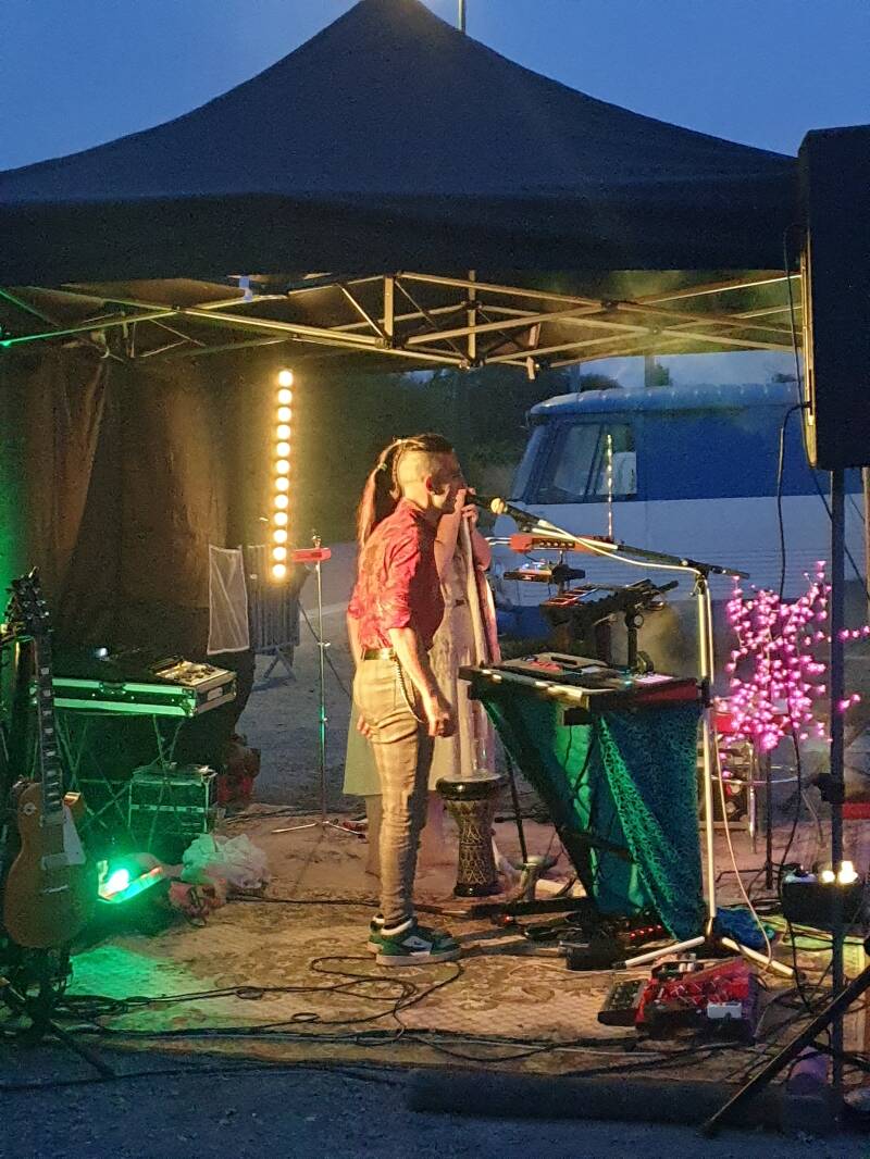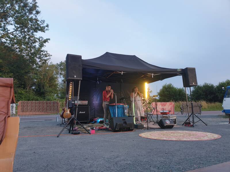 Eine Band, die aus der Manche kommt. Aus der Gegend hier. Sie spielen viel mit Licht und wie sie harmonieren - ihre Stimme, seine Gitarre und alles zwischendrin. Es ist so ein sicherer Rahmen hier. Die Menschen können sein, wie sie sind. Eine Frau, sie tanzt ausgelassen - vielleicht etwas verrückt. Manche schmunzeln (Didier & ich auch), aber die Leute (uns einbegriffen), freuen sich über ihre Freude.